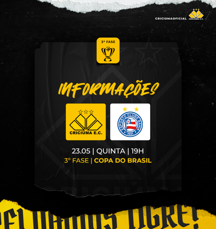 O Criciúma E.C. enfrentará o Bahia, pela 3ª fase da Copa do Brasil, dia 23/5. O confronto inicia às 19h, com a abertura dos portões sendo às 17h.