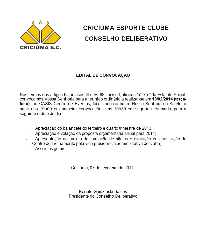O Conselho Deliberativo do Criciúma Esporte Clube convoca os conselheiros do clube para reunião ordinária nesta terça-feira (18/02), no Centro de Eventos Oasis, localizado no bairro Nossa Senhora da Salete. A primeira convocação será às 19 horas. A segunda ocorrerá às 19h30min.