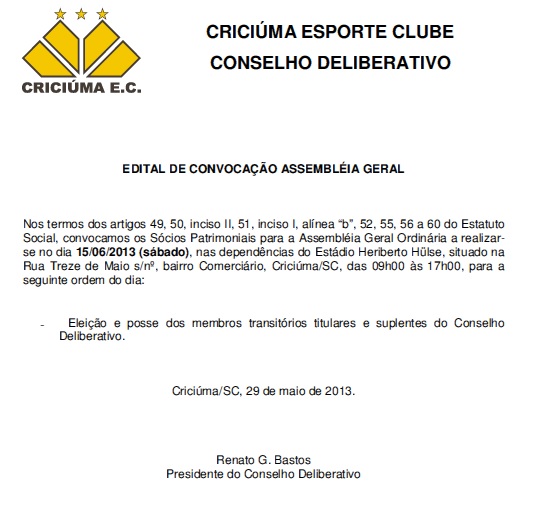 O Criciúma Esporte Clube convoca os sócios patrimoniais para Assembleia Geral Ordinária que será feita no dia 15 de junho nas dependências do estádio Heriberto Hülse. Na ocasião será feita a eleição e posse dos membros transitórios titulares e suplentes no Conselho Deliberativo.