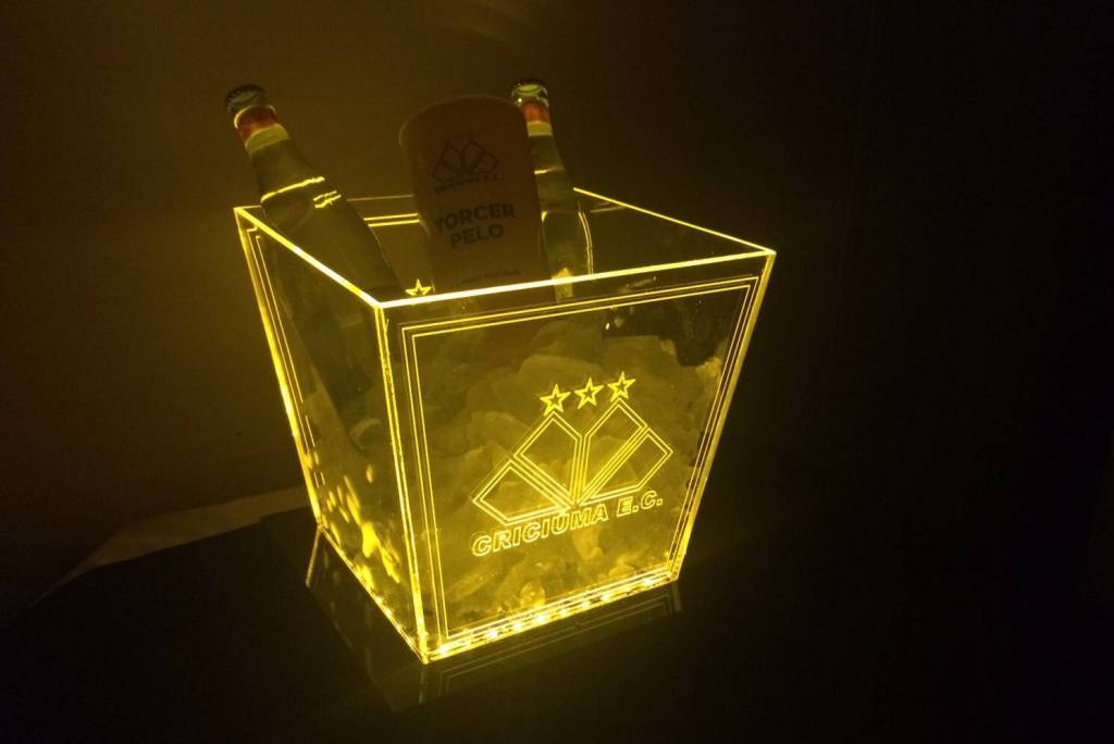 Somente para quem adquirir o produto antecipadamente terá a opção de personalizar com a inscrição de nomes. O balde de gelo possui o escudo do Criciúma aplicado em dois lados no acrílico. Quando ligado na tomada, as luzes de LED acendem na cor amarela, contornando o escudo carvoeiro e outras partes.
