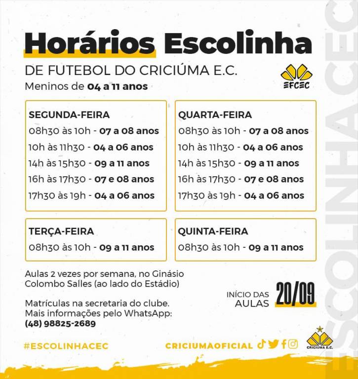 A Escolinha de Futebol do Criciúma para meninos de 4 a 11 anos já iniciou os treinamentos no ginásio Colombo Machado Salles, anexo ao estádio Heriberto Hülse. As matriculas seguem abertas e as atividades para cada categoria ocorrem duas vezes por semana.