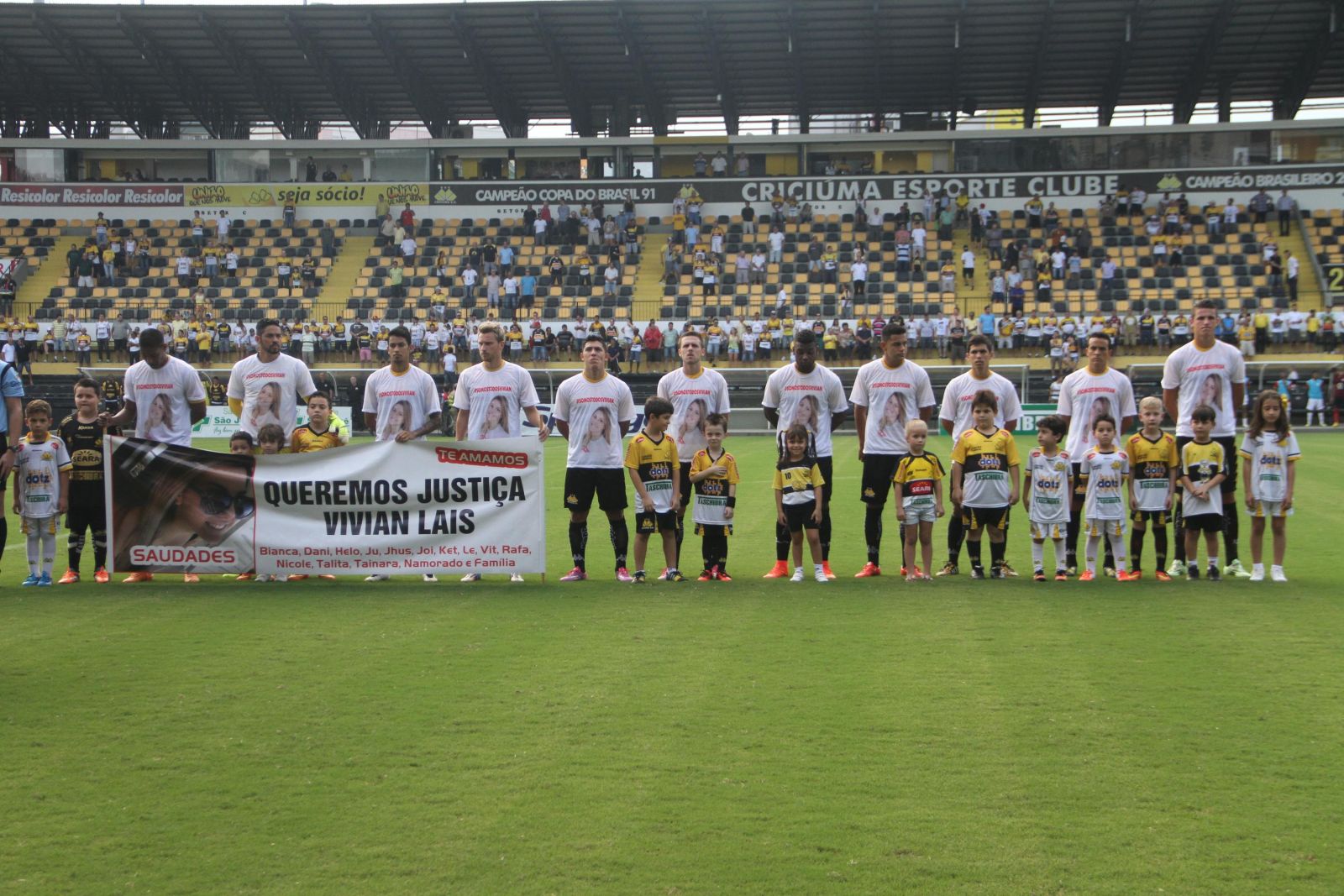 O Criciúma homenageou neste sábado (14/03) a jovem Vivian Lais Philipi, 17 anos, que foi brutalmente assassinada no município de Içara. Na entrada em campo para o duelo contra o Inter de Lages, no estádio Heriberto Hülse, os atletas carvoeiros entraram vestindo e segurando uma faixa, que pede justiça no caso. O crime ainda não foi solucionado.