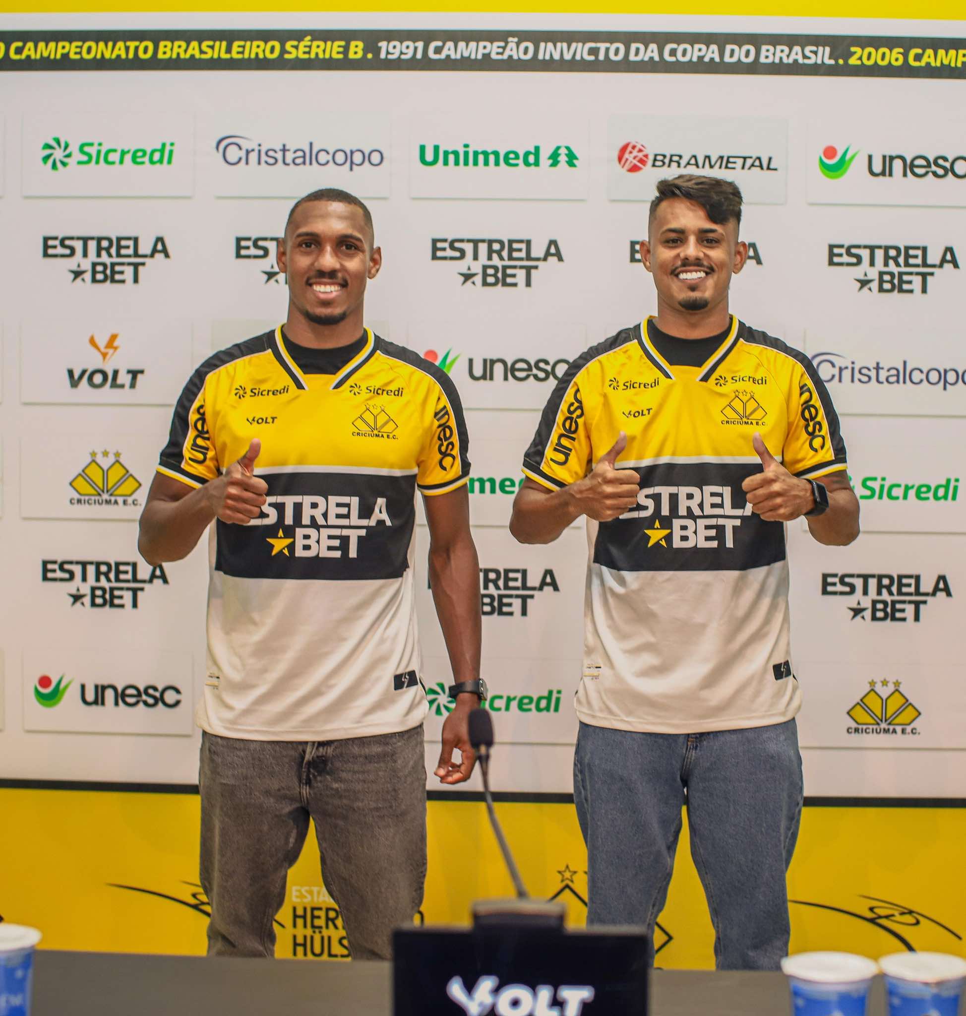 O Criciúma apresentou de forma oficial na tarde desta sexta-feira (17/01) mais duas novidades para a temporada 2025. O lateral-direito Léo Alaba, que vem de empréstimo do AFS Futebol SAD, de Portugal, e o meia-atacante Gabriel Barros, emprestado do Internacional, vestiram a camisa tricolor na Sala de Imprensa Clésio Búrigo, no estádio Heriberto Hülse. A entrevista coletiva foi transmitida ao vivo na TV Tigre, o canal oficial do clube no YouTube.