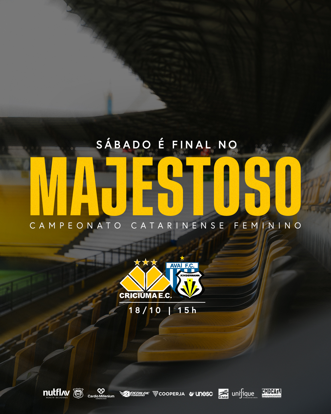 O Criciúma enfrenta o Avaí nesse sábado (18/10), às 15h, no Estádio Heriberto Hülse, pelo jogo de ida da final do Campeonato Catarinense Feminino. A entrada será liberada para a torcida nas cadeiras, e a partida contará com transmissão ao vivo da TV Tigre.