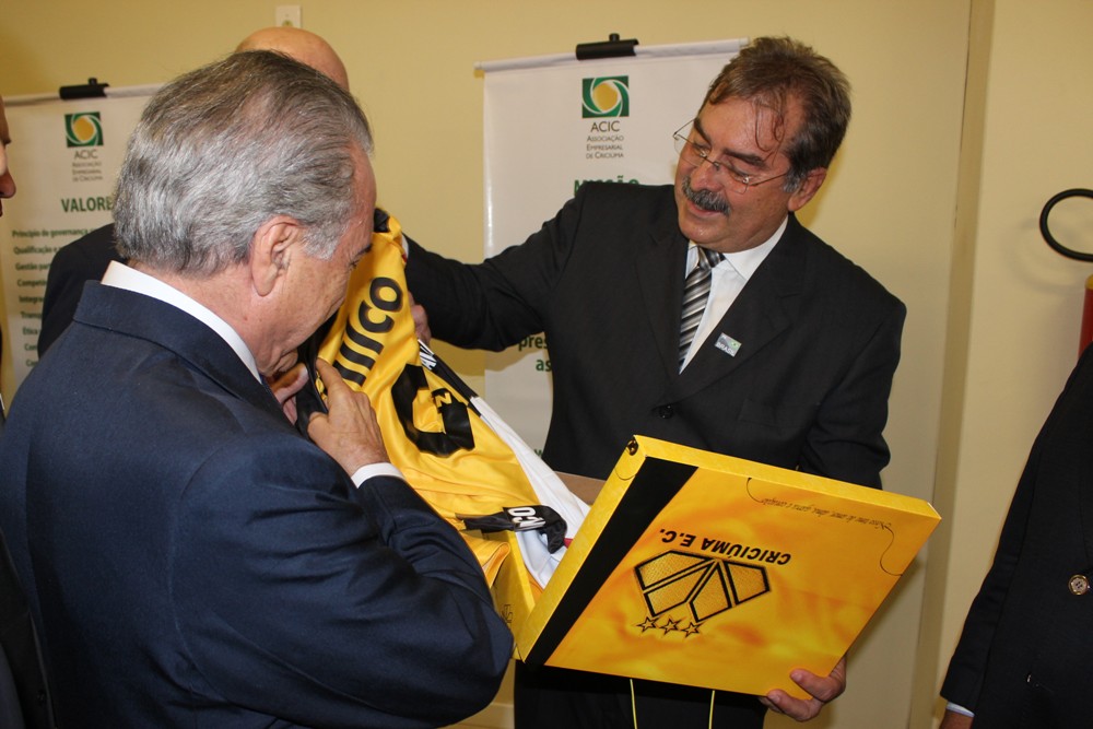 O vice-presidente da República, Michel Temer, participou de um evento em Criciúma na noite desta quinta-feira (20/03), na Associação Empresarial de Criciúma (ACIC). Durante sua visita à cidade, antes do início do evento, ele recebeu das mãos do vice-presidente administrativo e diretor de projetos do Tigre, Carlos Henrique Alamini, uma camisa oficial do Criciúma.