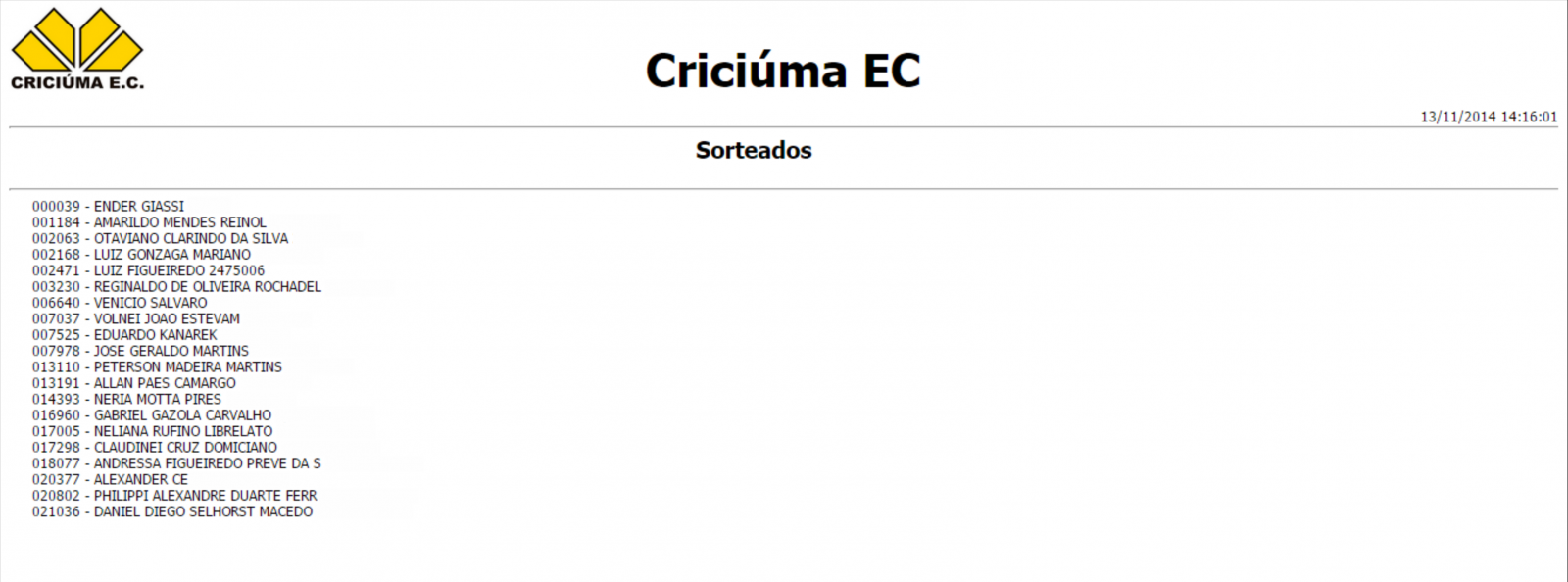 O Criciúma sorteou na tarde desta quinta-feira (13/11) 20 ingressos de arquibancada entre os sócios em dia. O sorteou ocorreu através de um sistema automático. As entradas são para o jogo deste sábado (15/11) contra o Grêmio, às 19h30min, no estádio Heriberto Hülse.