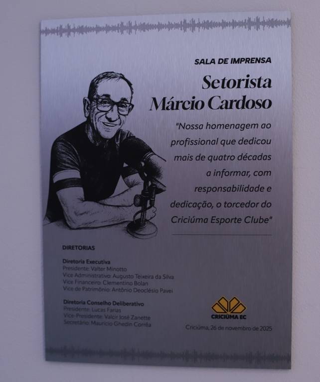 Márcio Cardoso te 63 anos e é um dos profissionais de imprensa mais conhecidos de Santa Catarina. Atualmente na Rádio Eldorado, ele reportou durante toda a sua trajetória profissional diversos jogos e importantes informações esportivas para a região sul do estado. "Estou imensamente feliz e emocionado com essa homenagem. Dediquei mais da metade da minha vida a informar, com responsabilidade, os torcedores do Criciúma. Quero agradecer ao clube e aos diretores pela homenagem. Divido essa alegria com meus colegas e amigos de trabalho, e também com a minha família que sempre foi muito paciente com as minhas ausências para os compromissos profissionais", destacou o homenageado.