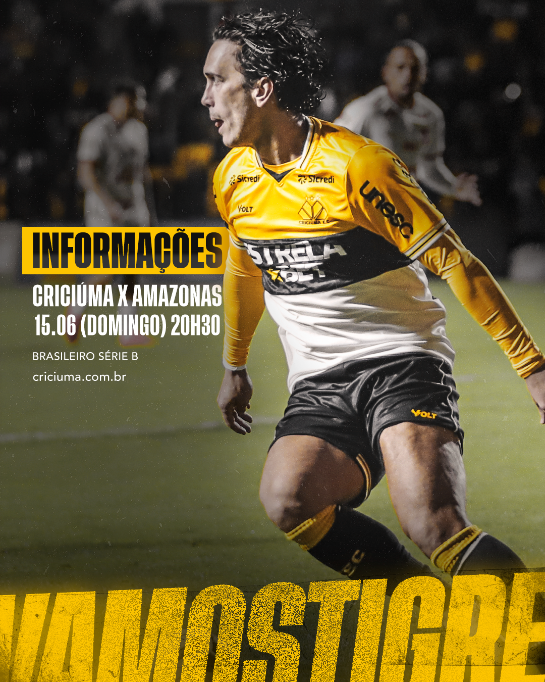Neste domingo (15/06), o Criciúma enfrenta o Amazonas, pelo Campeonato Brasileiro da Série B. A partida começará às 20h30, com a abertura dos portões programada para às 18h30. O ingresso de arquibancada inteiro custa R$100,00, enquanto a meia-entrada custa R$50,00 (válida para estudantes, pessoas com deficiência, idosos acima de 60 anos, entre outros, mediante comprovação conforme a legislação).
