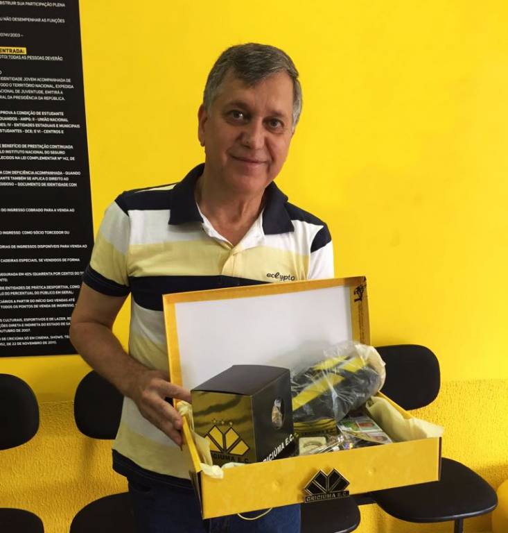 O Sócio em dia do Criciúma, João Batista Topanitti, compareceu nesta segunda-feira (23/10) na Loja Tigre Maníacos, em anexo ao estádio Heriberto Hülse, e resgatou o Kit de brindes do mês de outubro no qual foi sorteado. Ele ganhou um par de chinelos, um documentário em DVD, uma caneca gel, um chaveiro e uma caneta. Vai de brinde também um álbum de figurinhas completo do Campeonato Brasileiro 2017.
