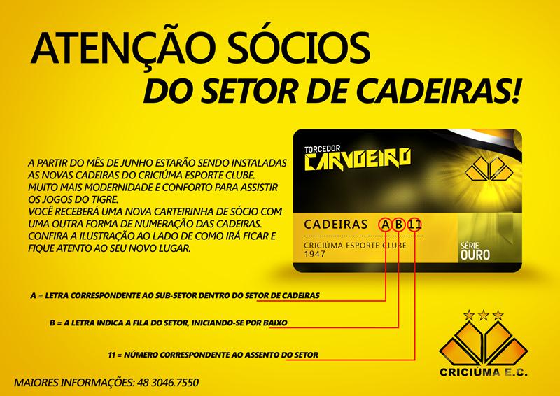 O Criciúma volta a jogar no estádio Heriberto Hülse no dia 16 de julho, contra o Fluminense. Nesse dia, a reforma no setor de cadeiras já estará concluída e a antiga carteirinha não passará mais nas catracas. Por isso, a direção pede para que os sócios do setor se antecipem e façam a troca o quanto antes, para evitar problemas no dia da partida. As carteirinhas já estão prontas na secretaria do clube e para realizar a troca basta levar a antiga.