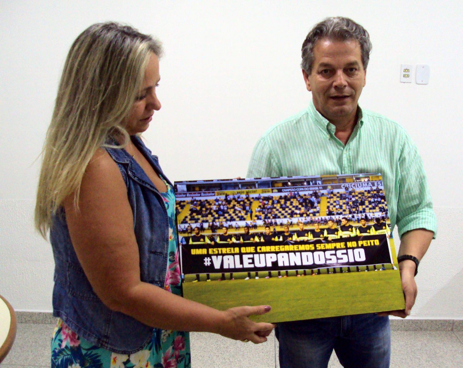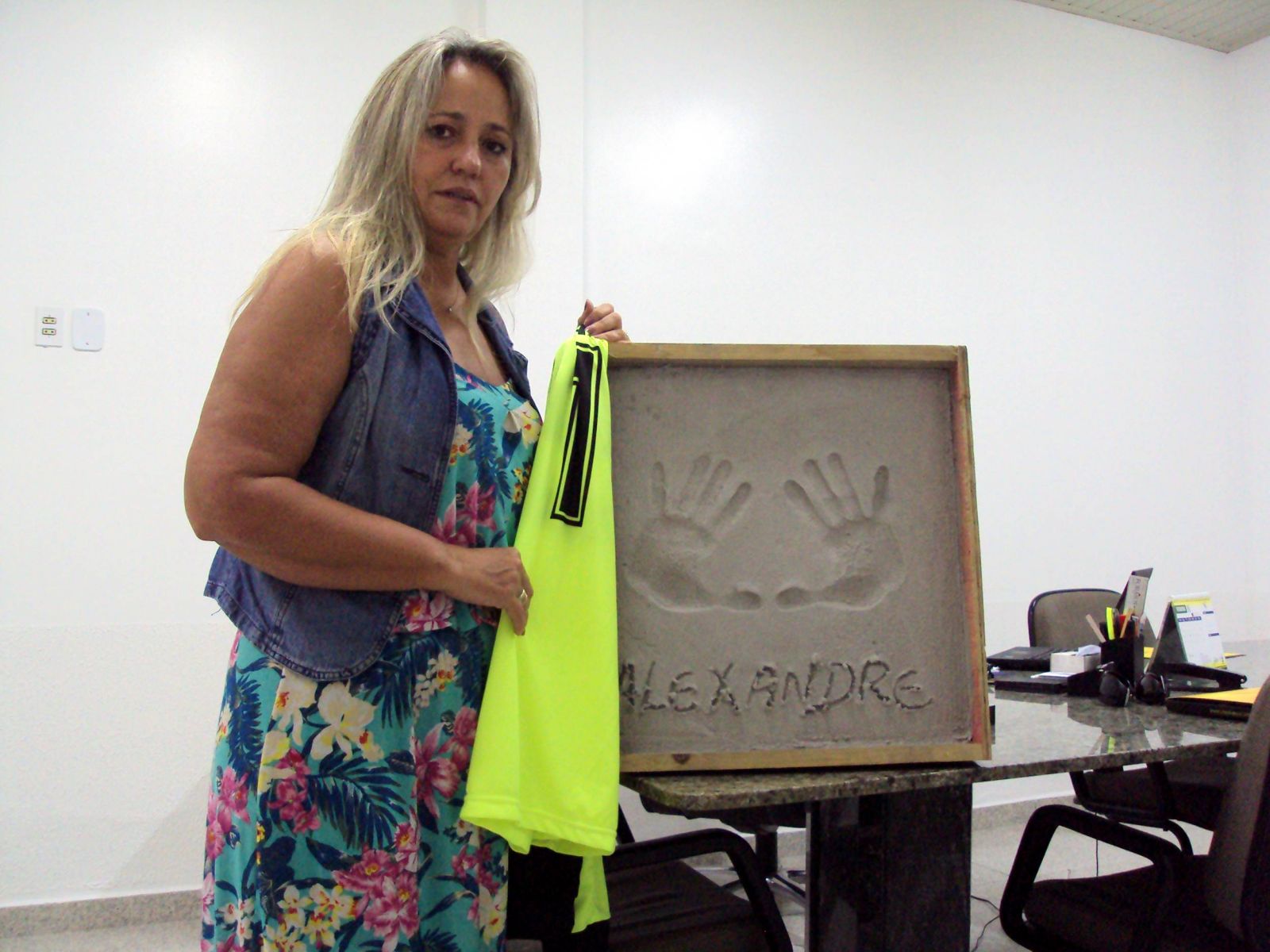 Raquel com a réplica da camisa de 1991 e o quadro com as marcas das mãos de Alexandre. Foto: Douglas Sartor/www.criciumaec.com.br
