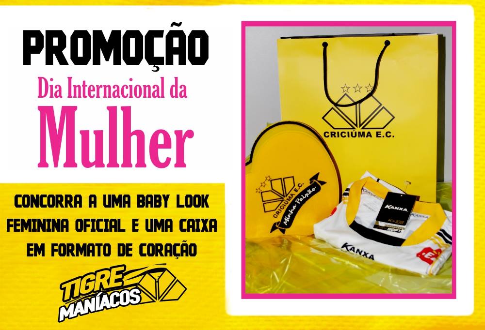 A loja Tigre Maníacos irá sortear para a torcida tricolor um kit com uma camisa baby look oficial do Criciúma e uma caixa em forma de coração em homenagem ao Dia Internacional das Mulheres. A promoção será feita através da página oficial da Tigre Maníacos no Facebook com o auxílio do aplicativo Yes ganhei. Para concorrer, é necessário acessar o link da promoção e clicar em “participar”, além de compartilhar o link em modo público e curtir a página da loja Tigre Maníacos.