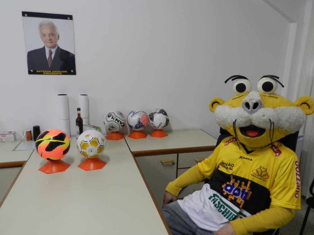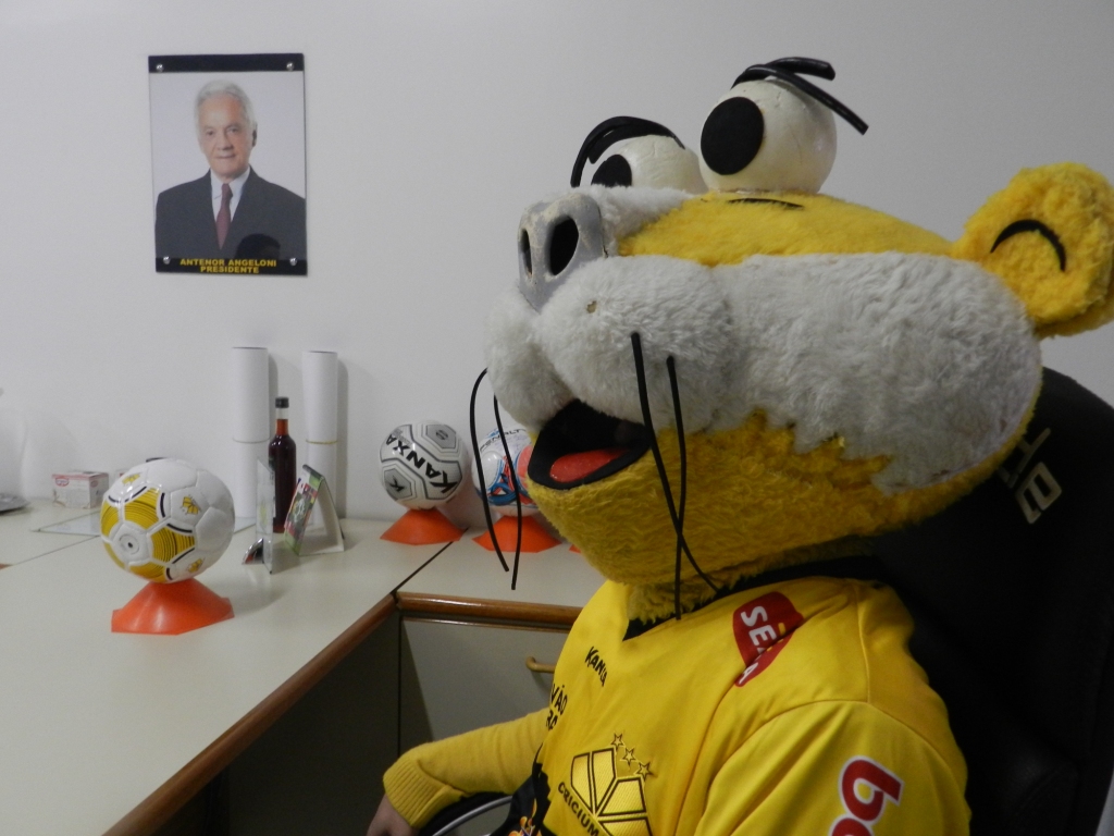 Mascote aproveitou a chance para sentar na cadeira do presidente. Foto: Lucas Jorge/criciumaec.com.br