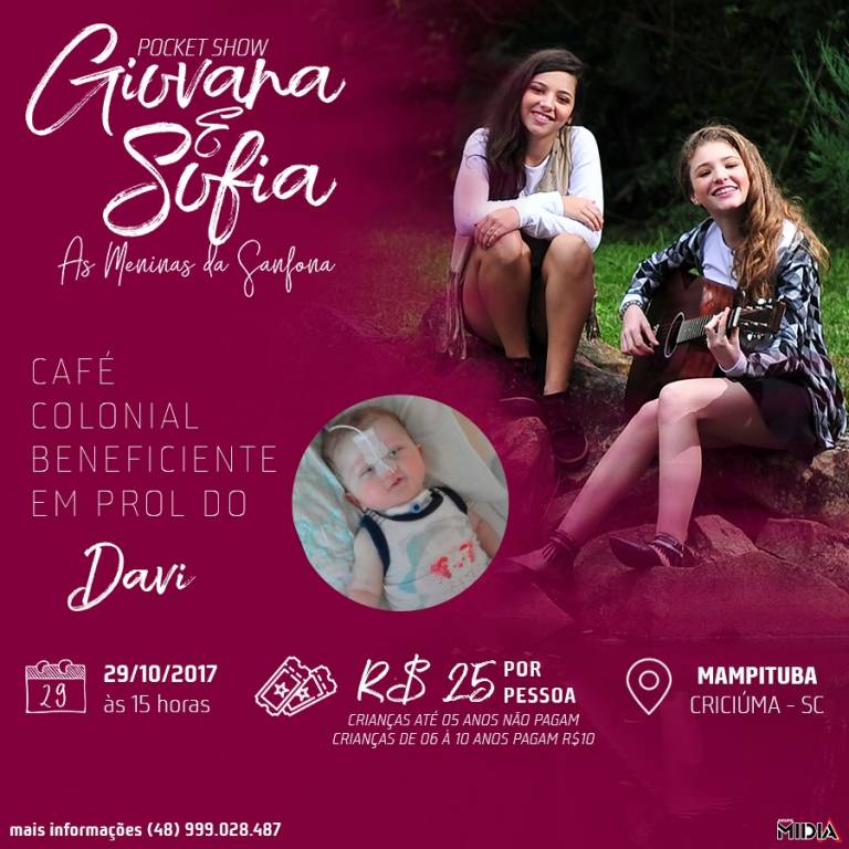 O pequeno Davi Giuliani foi diagnosticado com a Síndrome de Pierre Robin, uma doença congênita, que afeta a mandíbula, retrai a língua e obstrui as vias aéreas superiores. Com esse problema sério, os amigos da família de Davi estão promovendo um café colonial no dia 29 deste mês, às 15 horas, na Sociedade Recreativa Mampituba. O garoto Davi necessita de uma cirurgia e requer cuidados durante todo o dia.