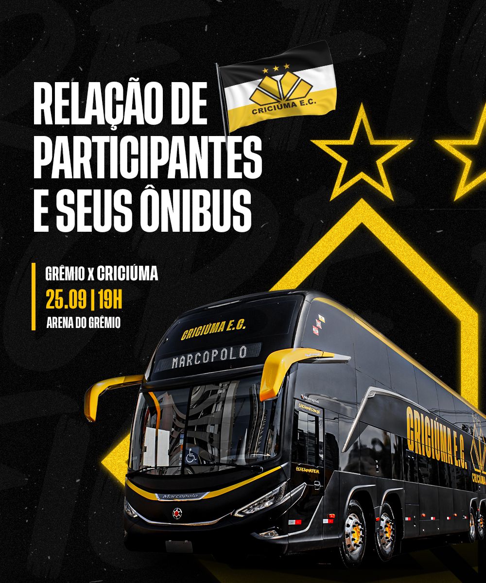O Criciúma divulgou a lista dos dez ônibus disponíveis para a ida a Porto Alegre nesta quarta-feira (25/09), para o jogo contra o Grêmio pelo Brasileirão. Os torcedores devem estar às 11h30 dentro dos ônibus para que o clube faça o ressarcimento do valor dos ingressos. A saída acontece pontualmente às 12h, no pátio do estádio Heriberto Hülse. A partida acontece às 19h30, na Arena Grêmio.