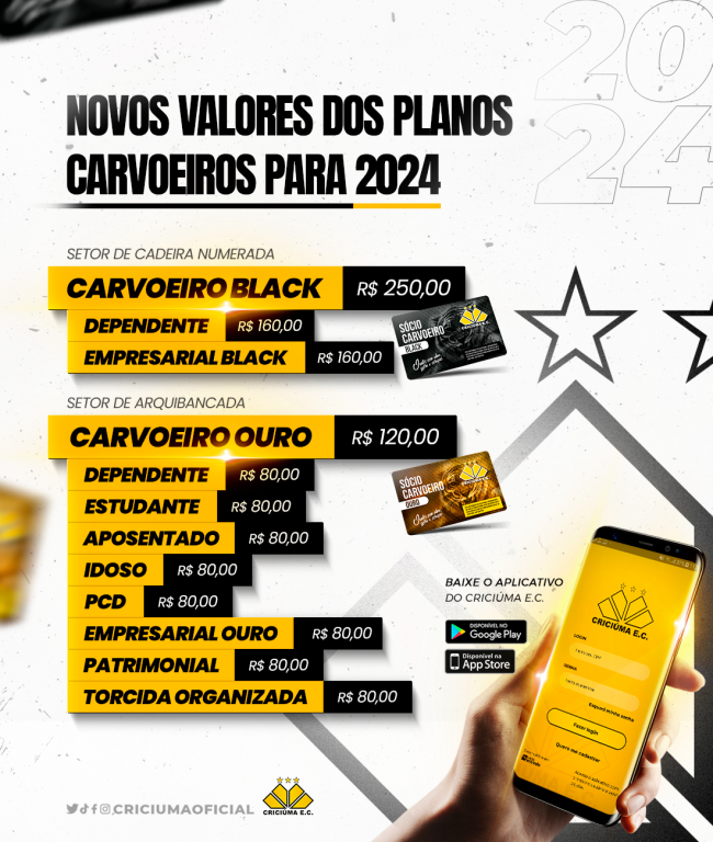 O Criciúma Esporte Clube anuncia que a partir de janeiro de 2024, serão aplicados novos valores nos planos de sócio torcedor. A empresa responsável pela gestão dos planos iniciará o processo de alteração dos valores nos cadastros de cada sócio.