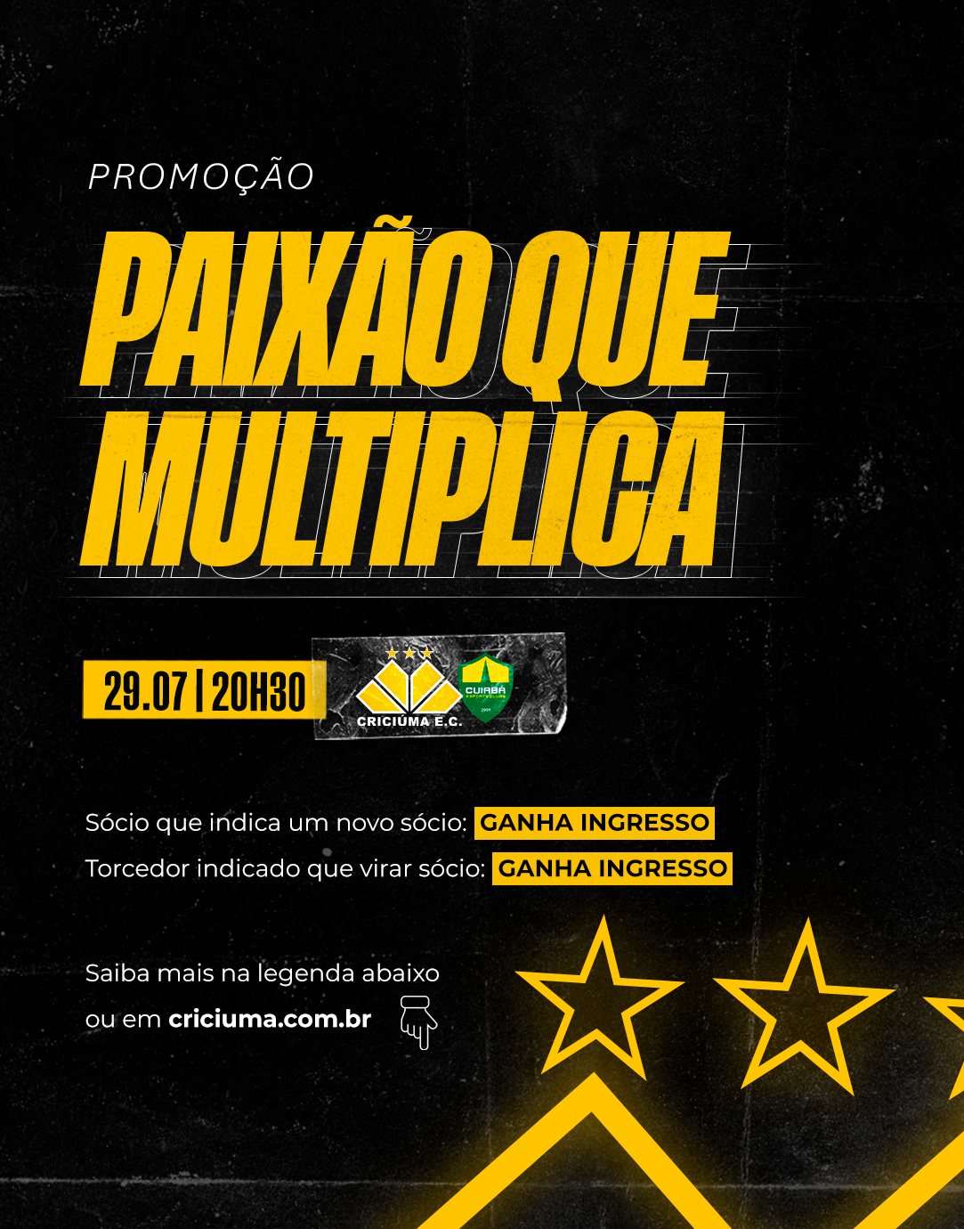 O Criciúma entra na reta final das novas adesões na arquibancada e, para marcar esse momento, anuncia um benefício exclusivo para os últimos torcedores a garantirem sua associação no plano Carvoeiro Ouro.