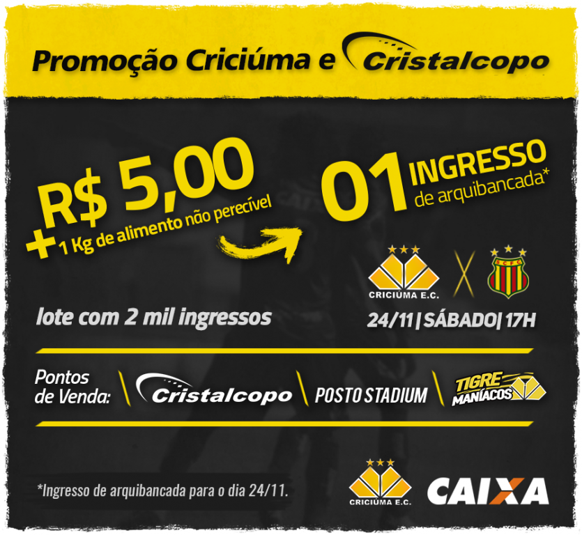 O Criciúma, em parceria com a Cristalcopo lança promoção especial de ingressos para o jogo deste sábado (24/11), às 17 horas, contra o Sampaio Corrêa, no estádio Heriberto Hülse, pela 38ª rodada do Campeonato Brasileiro da Série B. Haverá um lote de 2 mil ingressos de arquibancada ao valor de R$ 5,00 cada e mais um quilo de alimento não perecível.