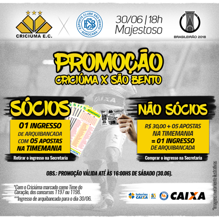 O Criciúma lança promoção de ingressos para o jogo de sábado (30/06), às 18 horas, contra o São Bento (SP), no estádio Heriberto Hülse, pelo Campeonato Brasileiro da Série B. Haverá oportunidades para comprar ingressos mais baratos para sócios ou não sócios.