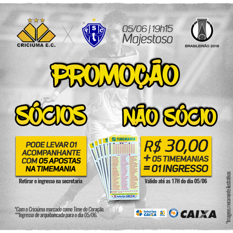 Até às 17 horas desta terça-feira (05/06), os NÃO SÓCIOS podem comprar ingresso de arquibancada ao valor de R$ 30,00 mais 05 apostas na Timemania, marcando o Criciúma como time no coração no concurso 1188 (terça-feira).