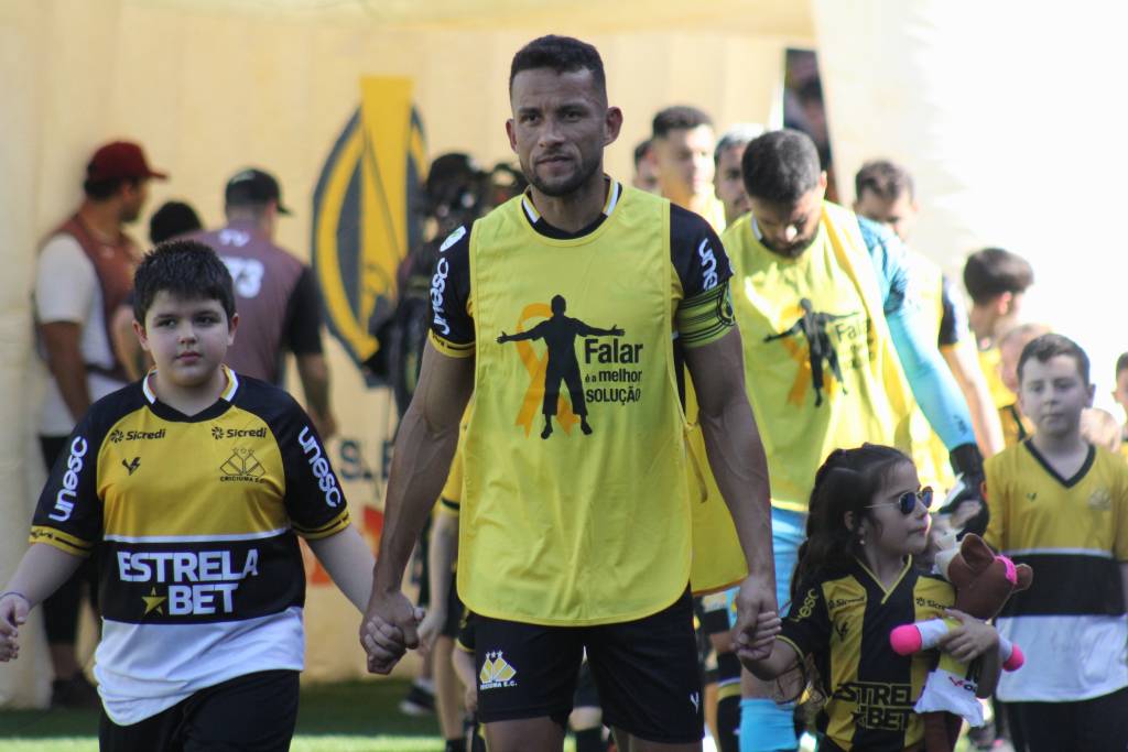 Jogadores das duas equipes entraram em campo com coletes em alusão ao Setembro Amarelo, o mês de conscientização da prevenção ao suicídio. Foto: Celso da Luz/ Assessoria de imprensa C.E.C.