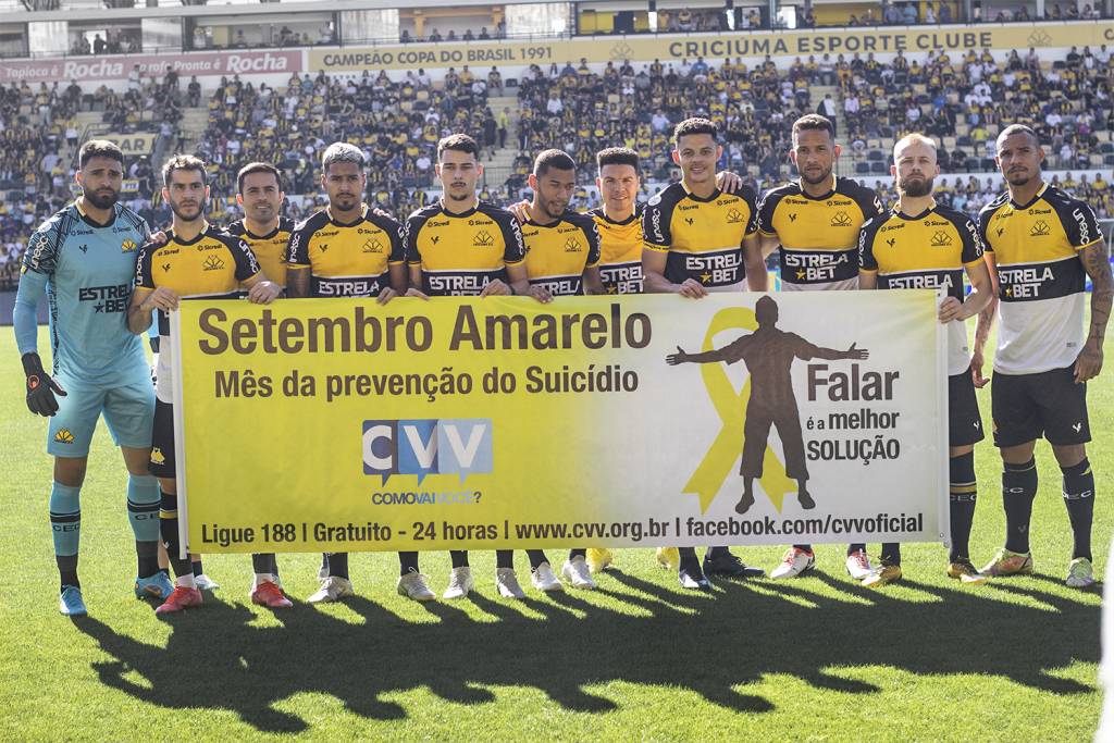 Jogadores seguram uma faixa em alusão ao Setembro Amarelo, o mês de conscientização da prevenção ao suicídio. Foto: Cleiton Ramos