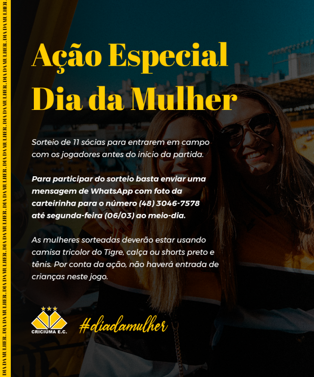 Em comemoração ao Dia Internacional da Mulher, o Criciúma vai realizar uma ação especial no jogo diante do Atlético Catarinense, na próxima terça-feira (07/03), no Heriberto Hülse.