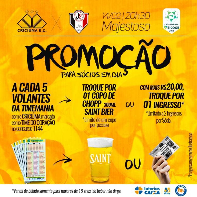 Os associados podem comprar ingresso de arquibancada ao preço de R$ 20,00, mais cinco apostas na Timemania marcando o Criciúma como time do coração, no concurso 1144. O limite é de dois ingressos para sócio. Para quem é associado e não quer comprar outro ingresso pode fazer as mesmas cinco apostas na Timemania e trocar por um chopp de 300 ml da Saint Bier.