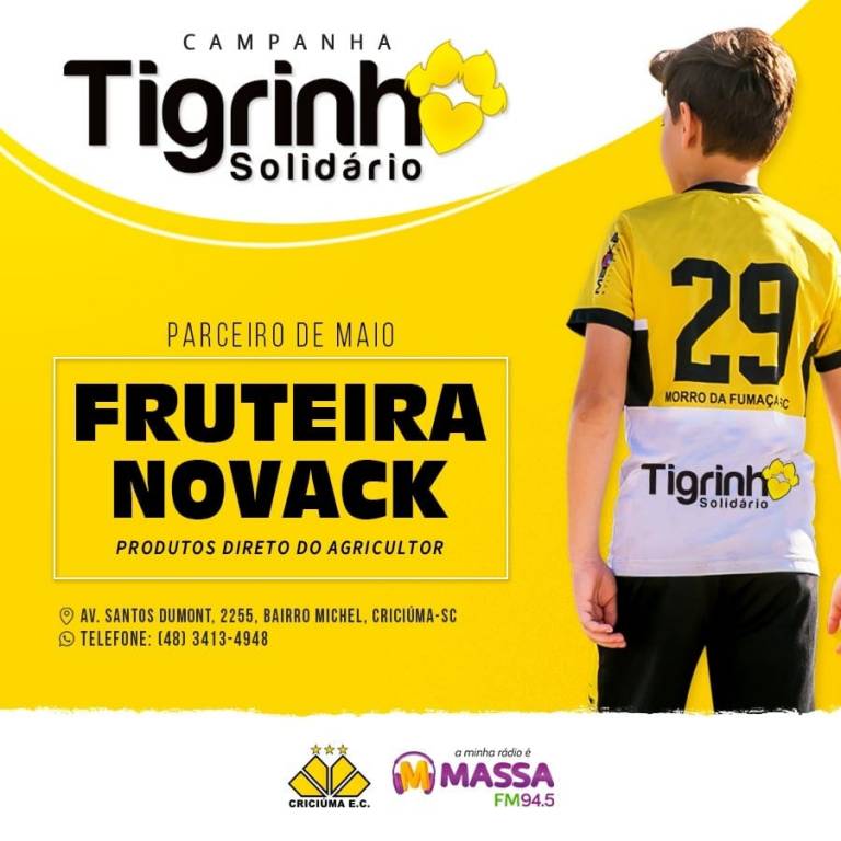 O Criciúma, em parceria com a rádio Massa FM, deu continuidade na Campanha Tigrinho Solidário neste ano de 2020. A Fruteira Novack entrou como a nova parceira do mês de maio. A assinatura ocorreu na manhã desta sexta-feira (08/05) no estádio Heriberto Hülse.