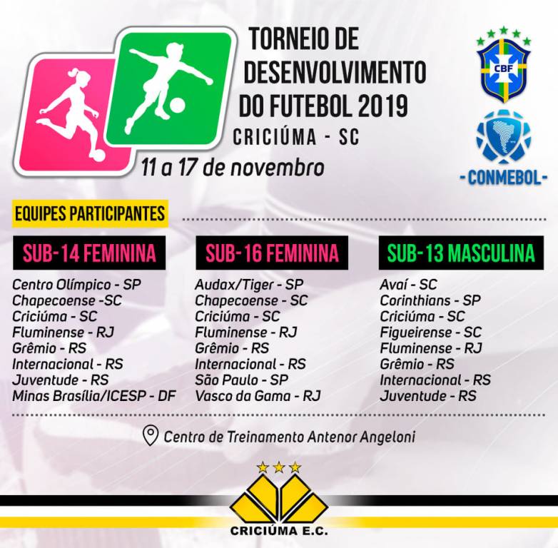 O Criciúma sediará a etapa Brasil do Torneio de Desenvolvimento de Futebol da CONMEBOL entre os dias 11 e 17 de novembro. Os confrontos das categorias Sub-13 masculino, e Sub-14 e Sub-16 feminino terão início na terça-feira (12/11), no Centro de Treinamento Antenor Angeloni. O sub-16 feminino enfrenta o São Paulo na estreia, às 9 horas. Já o Sub-14 feminino terá sua primeira partida contra o Juventude às 10h10min. Os garotos do Sub-13 masculino duelam com o Internacional, às 15 horas.