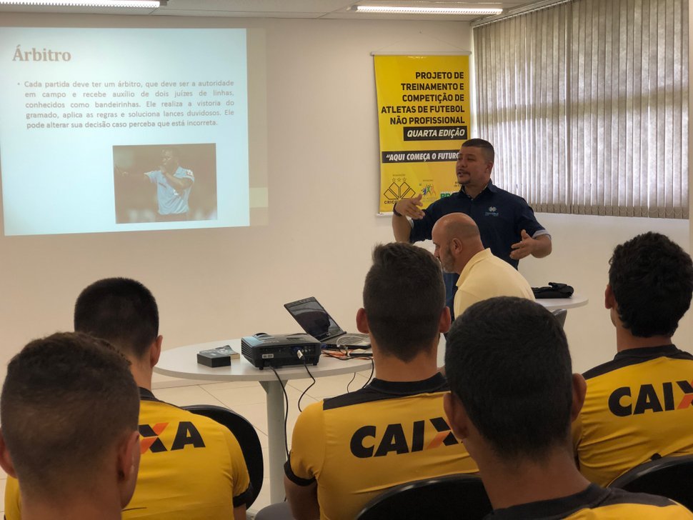 Os atletas da categoria Sub-20 do Criciúma participaram na tarde desta quarta-feira (28/03) de uma palestra sobre arbitragem. O bate papo com os atletas, realizado no auditório do Centro de Treinamento, no bairro Cristo Redentor, foi comandado pelo árbitro José Nazareno Marcelino, que apitou por muitos anos competições profissionais.