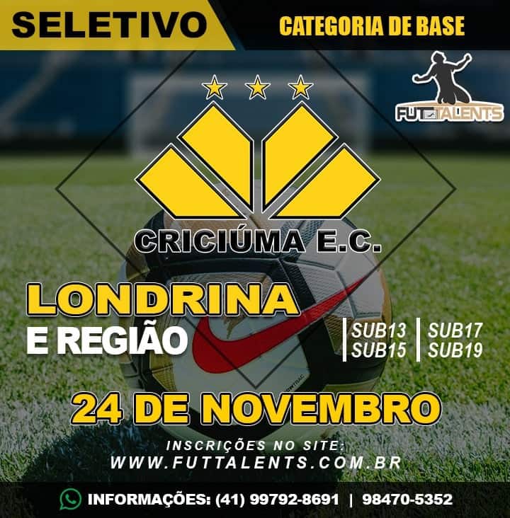Mais uma avaliação será realizada para as divisões de base do Criciúma. No dia 24 de novembro irá ocorrer uma seletiva para novos atletas do Tigre para as categorias de Sub-13 a Sub-19 em Londrina, no estado do Paraná. O observador técnico da base carvoeira, Benevan Ribeiro, estará presente.