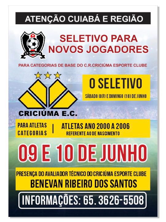 O Criciúma irá realizar avaliações de atletas para servir as categorias de base do clube. No sábado e domingo (09 e 10/06), o avaliador técnico do Tigre, Benevan Ribeiro dos Santos, estará em Cuiabá para avaliar atletas nascidos de 2000 a 2006.