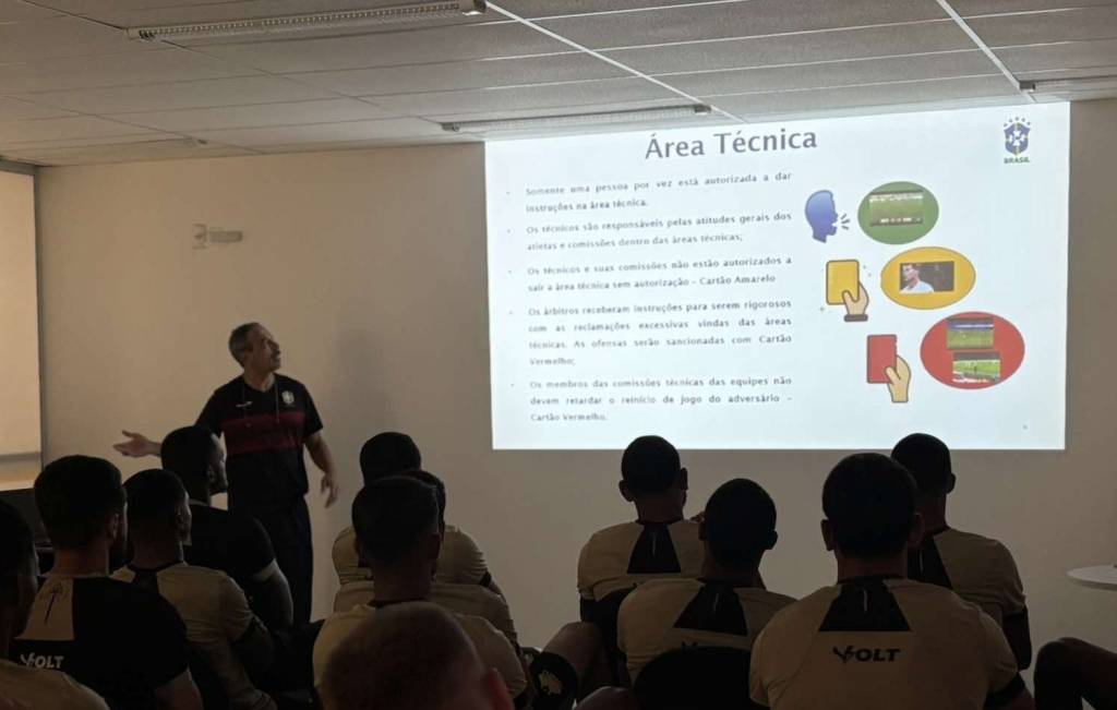 Os atletas do Criciúma participaram de uma palestra sobre as novas diretrizes da arbitragem para o Campeonato Brasileiro da Série B 2025. O encontro ocorreu na manhã desta quinta-feira (20/03) no auditório do Centro de Treinamento Antenor Angeloni e foi ministrado pelo instrutor de arbitragem da Confederação Brasileira de Futebol (CBF), Fifa e da Federação Catarinense de Futebol (FCF), Vayran da Silva Rosa.