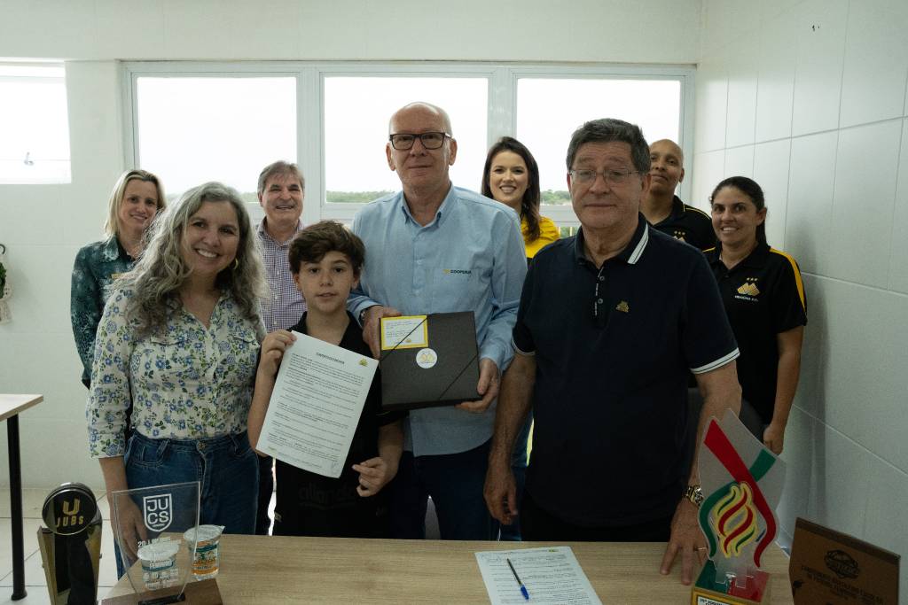 Na semana passada, o time de futebol feminino do Criciúma recebeu a visita de representantes da Cooperja para oficializar a continuidade do patrocínio durante a temporada de 2024. A assinatura do contrato aconteceu na sala da presidência do clube, localizada no estádio Heriberto Hülse. O encontro contou com a participação do Diretor de B2B da Cooperja, Carlos Roberto Wilk, do presidente do clube, Vilmar Guedes, do Gerente Administrativo, Paulo Cesar Bitencourt, e das técnicas do clube.