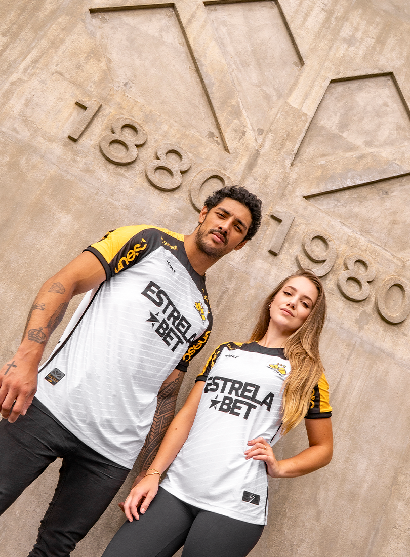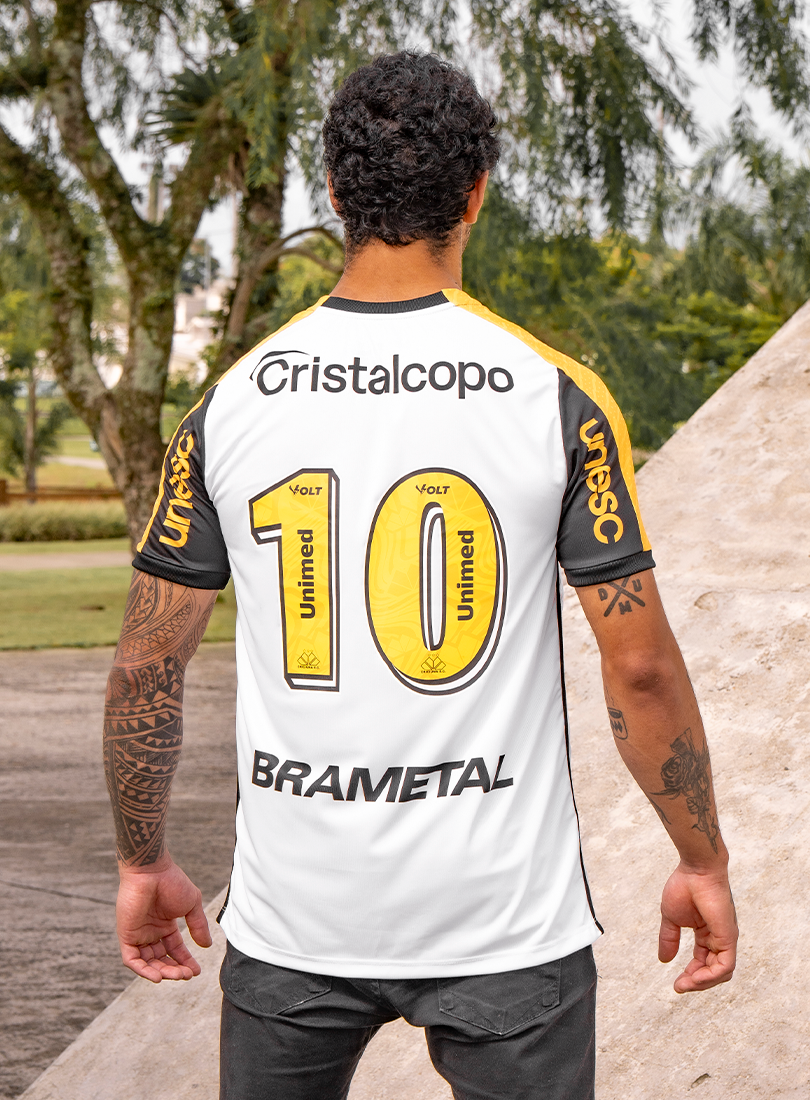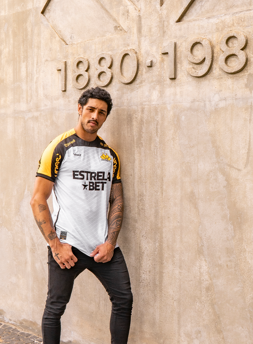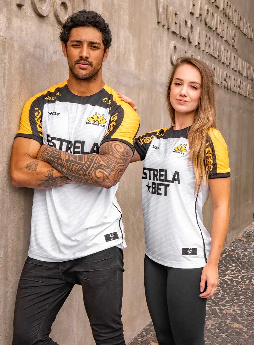 O Criciúma Esporte Clube e a Volt Sport apresentam a nova camisa padrão 2 para a temporada, trazendo um design que homenageia um dos elementos mais icônicos da cidade: o petit-pavé. A peça, predominantemente branca, conta com os ombros em amarelo e preto e estampa especial inspirada nos tradicionais mosaicos que fazem parte da identidade cultural de Criciúma.