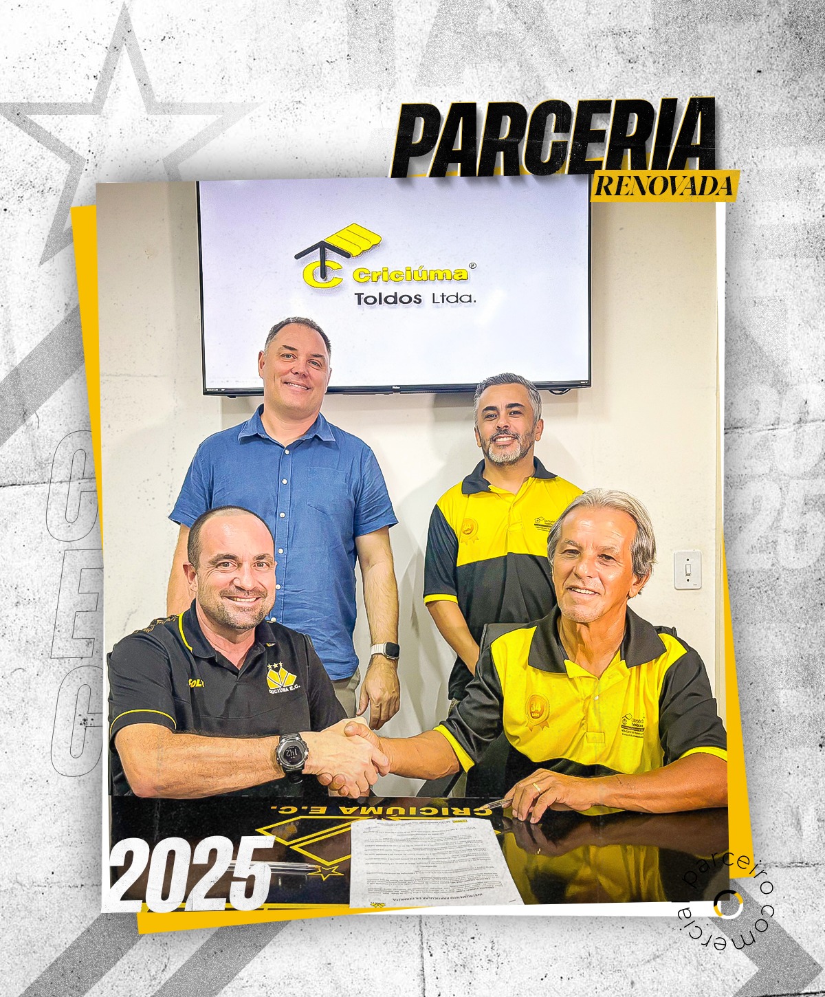 Parceiros na valorização da estrutura do Tigre, o Criciúma Esporte Clube e a Criciúma Toldos anunciaram a renovação da parceria para 2025. O acordo garante a continuidade do fornecimento de toldos e da revitalização dos bancos de reservas do clube, reforçando o compromisso em proporcionar mais conforto e segurança para jogadores e torcedores. A assinatura do contrato aconteceu na sala da presidência do estádio Heriberto Hülse, com a presença do vice-presidente Guto Silva, do diretor de marketing do clube, Fernando Maragno e dos representantes da empresa.