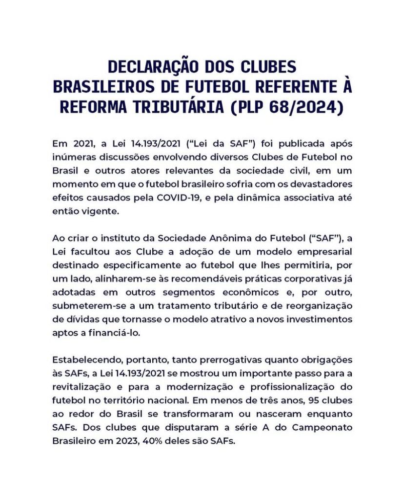 Clube:Declaração dos clubes brasileiros de futebolreferente à Reforma Tributária (PLP 68/2024)
