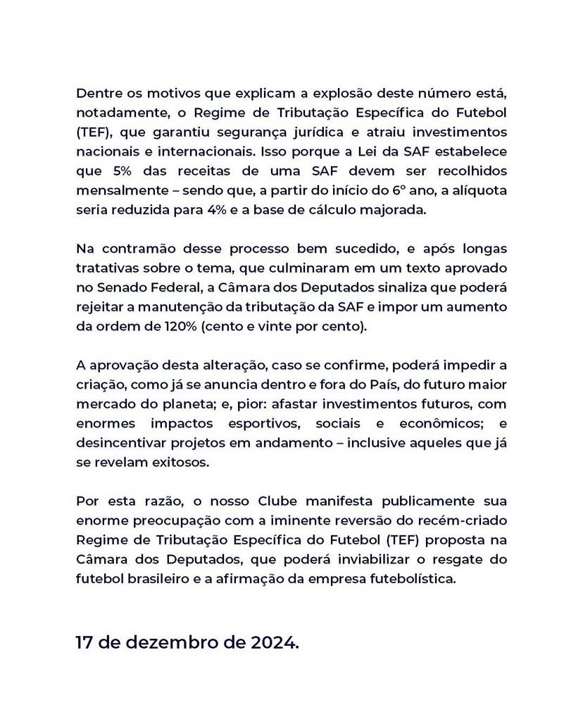 Por esta razão, o Clube abaixo identificadomanifesta publicamente sua enorme preocupação com a iminente reversão do recém-criado Regime de Tributação Específica do Futebol (TEF) proposta na Câmara dos Deputados, que poderá inviabilizar o resgate do futebol brasileiro e a afirmação da empresa futebolística.