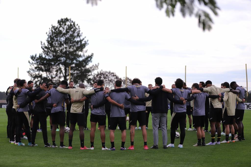 No treinamento, o grupo trabalhou a parte técnica divididos em dois grupos. A atividade objetivou os passes e movimentações. Depois, o técnico Eduardo Baptista organizou a equipe taticamente, realizando ajustes.