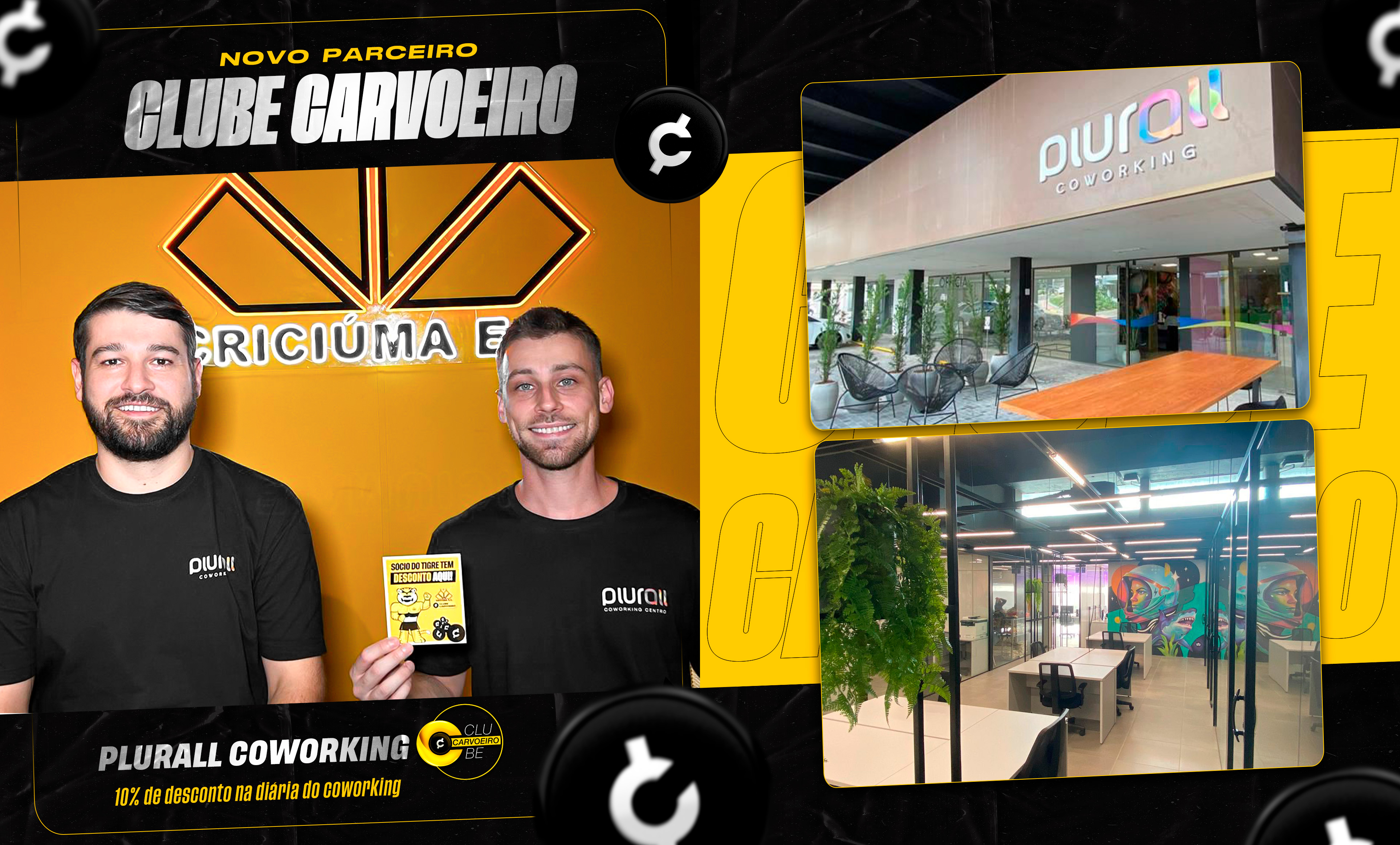A Plurall Coworking é o mais novo parceiro do Clube Carvoeiro. A empresa firmou um acordo com o Criciúma E.C. e oferecerá 10% de desconto na diária de mesa do coworking e nas horas de uso de sala de reunião em horário comercial para sócios que estiverem em dia com o clube.