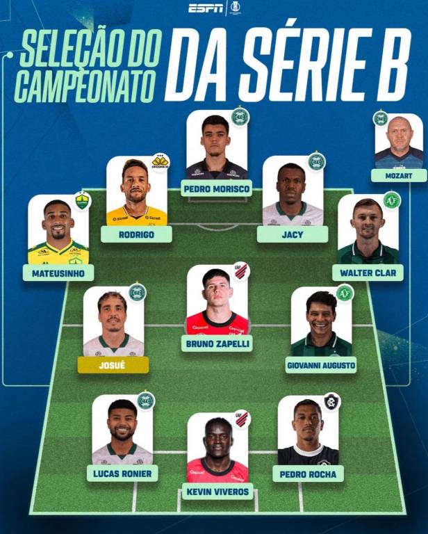 A seleção 2025 da Série B da ESPN ficou da seguinte forma: Pedro Morisco (Coritiba); Matheusinho (Cuiabá), Rodrigo (Criciúma), Jacy Maranhão (Coritiba), Walter Clar (Chapecoense); Josué (Coritiba), Bruno Zapelli (Athletico Paranaense), Giovanni Augusto (Chapecoense); Lucas Ronier (Coritiba), Kevin Viveros (Athletico Paranaense) e Pedro Rocha (Remo). O melhor técnico foi Mozart (Coritiba) e Josué foi considerado o melhor jogador de 2025.