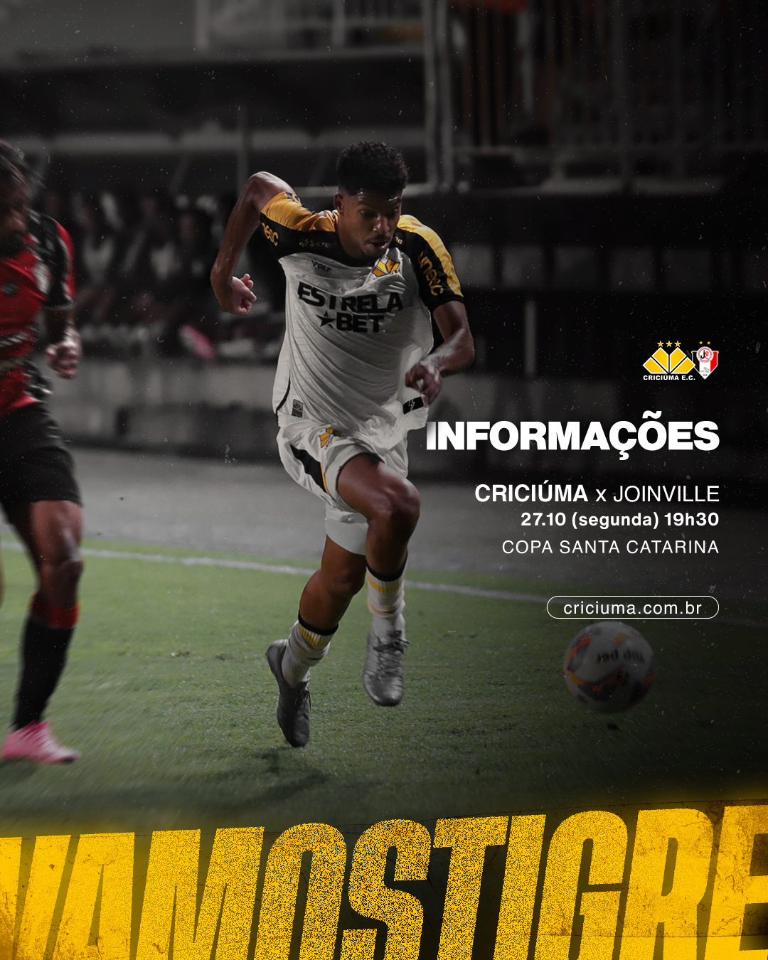Nesta segunda-feira (27/10), o Criciúma enfrenta o Joinville, pela Copa SC. A partida começará às 19h30, com a abertura dos portões programada para às 18h30. O ingresso de arquibancada inteiro custa R$50,00, enquanto a meia-entrada custa R$25,00 (válida para estudantes, pessoas com deficiência, idosos acima de 60 anos, entre outros, mediante comprovação conforme a legislação).