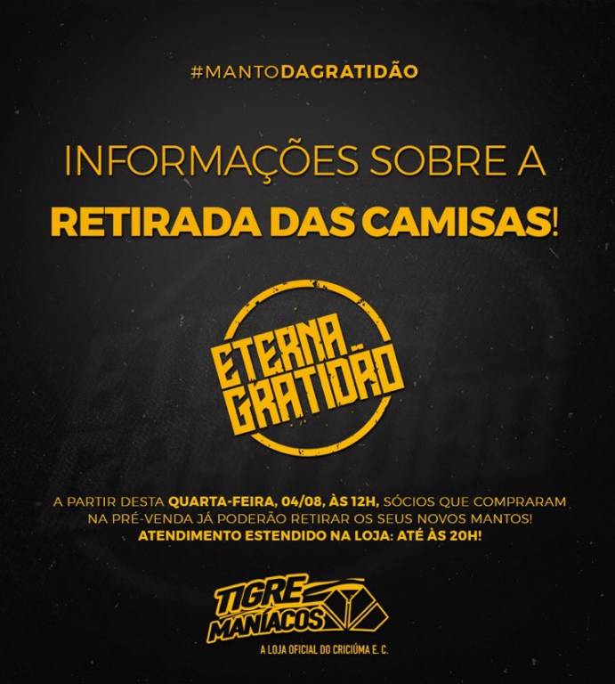 Os sócios do Criciúma que compraram o novo terceiro uniforme poderão iniciar a retirada da sua nova camisa nesta quarta-feira (04/08), a partir das 12 horas, na loja Tigre Maníacos, no estádio Heriberto Hülse. O Manto da Gratidão foi lançado no dia 25 de junho através das redes sociais do Tigre. Para retirá-lo, basta trazer o voucher até a Loja (que estará aberta em horário estendido até às 20 horas), e aguardar a personalização do patch.