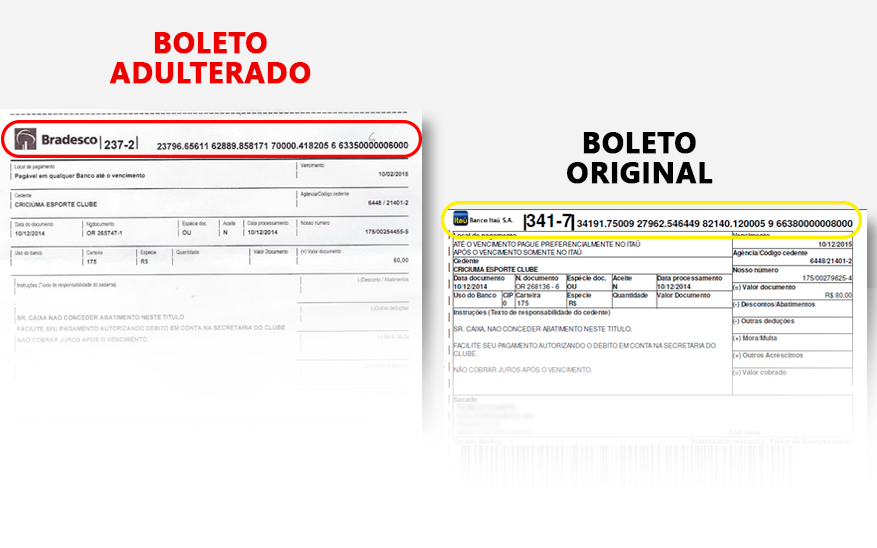 Boletos adulterados aparecem com outra agência bancária.