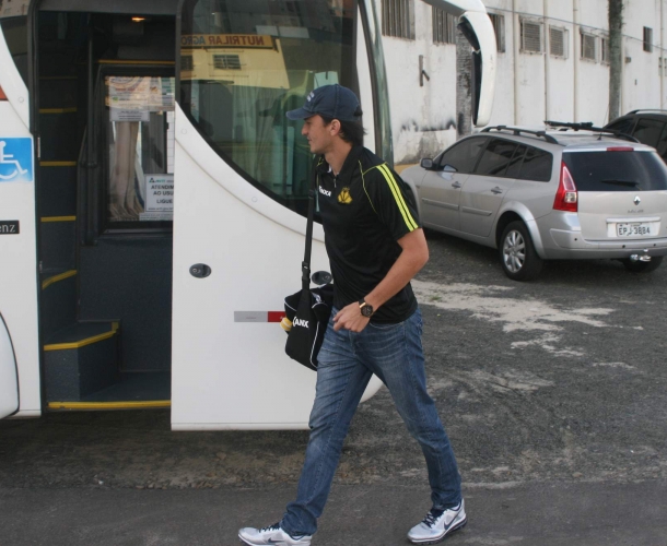 Legenda: Embarque da delegação do Criciúma com destino a Natal (RN), na manhã desta quinta-feira (08/11), no pátio do estádio Heriberto Hülse. Na foto, o zagueiro Matheus Ferraz.