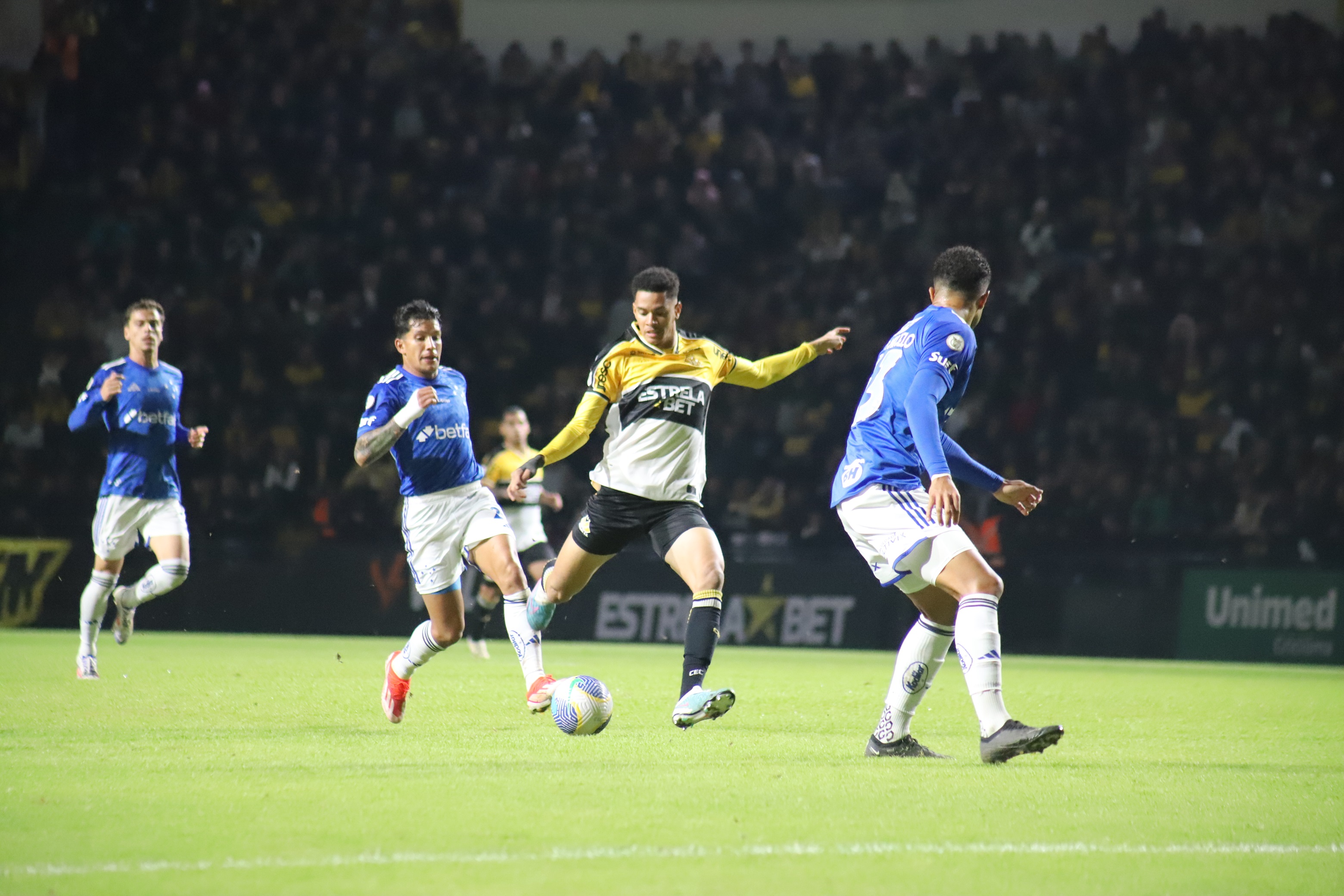 Legenda: Momentos de Criciúma x Cruzeiro na noite desta quarta-feira (03/07) na 14ª rodada da Série A do Campeonato Brasileiro.