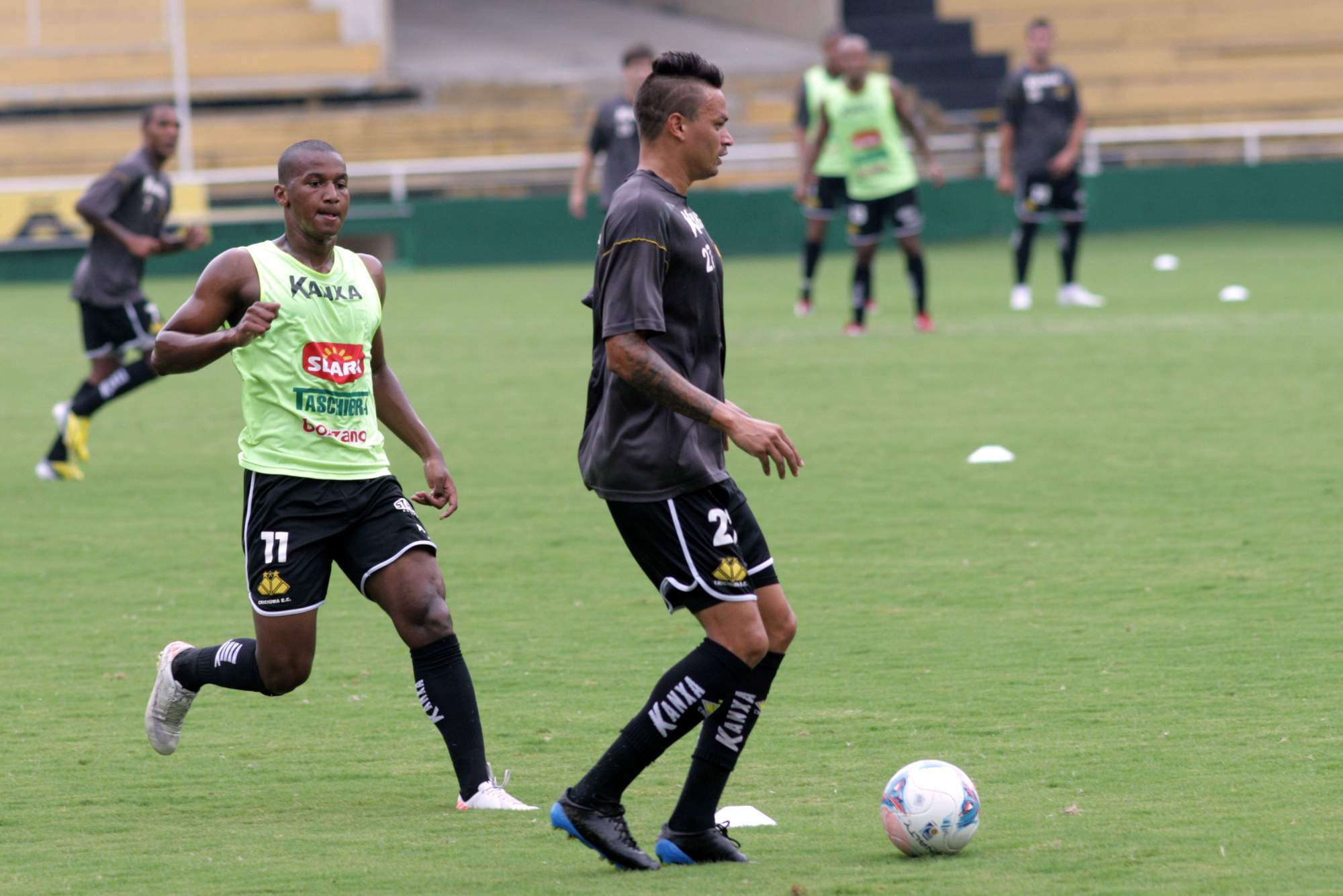 Legenda: Diego Renan (E) e Fabinho (D) em treino do Criciúma no estádio Heriberto Hülse na tarde desta quinta-feira (14/02)