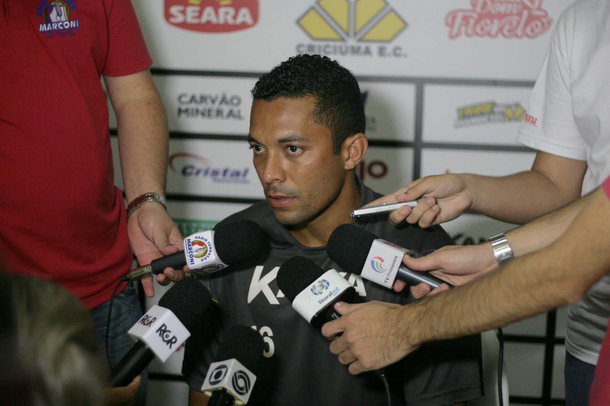 Legenda: Entrevista coletiva com o meia Élson na sala de imprensa do estádio Heriberto Hülse na tarde desta quinta-feira (14/02)